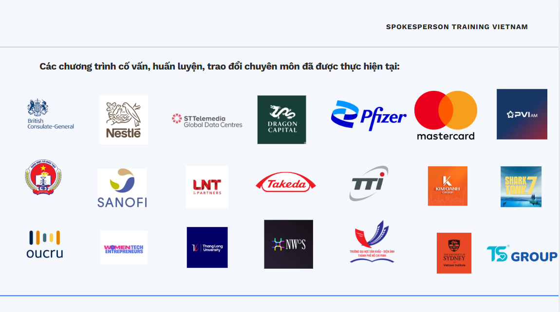 Phát triển tư duy và kỹ năng: Phát triển nội dung thông điệp, huấn luyện kỹ năng giao tiếp ngôn ngữ, giao tiếp phi ngôn ngữ, trả lời các câu hỏi bẫy, hỏi khó, và kể chuyện. Thực hiện các nội dung phỏng vấn giả lập cho các nền tảng truyền thông như báo in, báo hình, phát thanh…, phát biểu chính tại sự kiện…